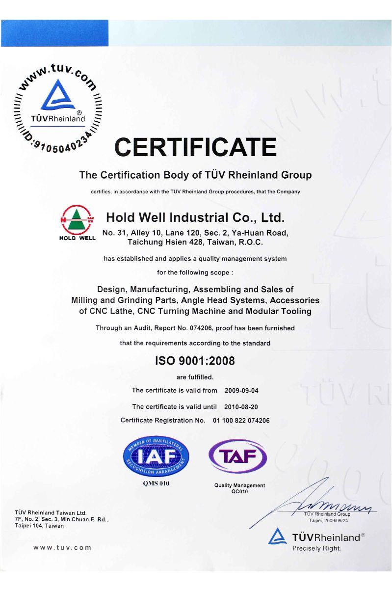Certification: According to JIS and other international standards, Hold Well strictly control the quality of our products. Moreover, Hold Well accredited ISO09001 Certificate by TUV Rheinland in 2007.